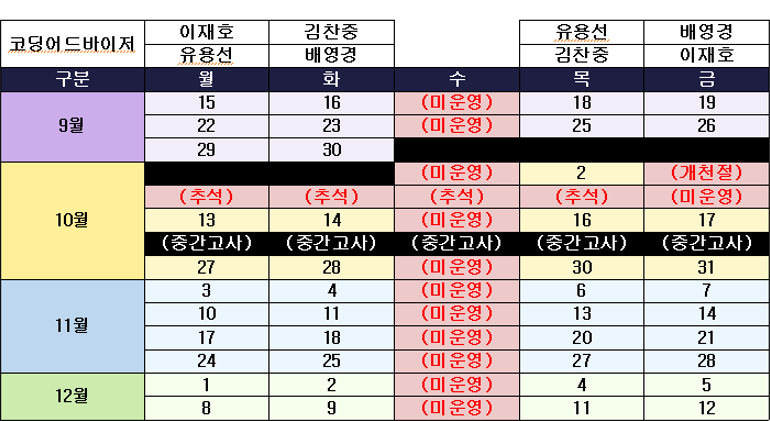 1. 운영기간 및 장소 1) 기간 : 2025년 9월 15일(월)부터 12월 12일(금)까지 ✓ 단, 중간고사 및 공휴일 제외 (10월 3일(금)~10월 10일(금) 미운영), 수요일 제외 2) 시간 : 월, 화, 목, 금요일, 오후 6시~10시 (4시간/일) ✓ 동시 근무 튜터 2인 3) 장소 : 208관 6층 PC실 (소프트웨어학부 실습실, “팀프로젝트실 5”) 2. 참여 자격 : 소프트웨어학부 재학생 전원 상시 Help Desk 방문 가능. ✓ 튜티는 Help Desk 최초 방문 시 “튜티 신청서”(첨부의 "2025-2학기 코딩HelpDesk-양식-튜티-SW학부")제출 필요 (1회에 한함, 튜터에게 제출) ✓ 기말고사 전까지 “만족도 조사” 제출 필요 (pdf 스캔후 SW교육원 이메일sw@cau.ac.kr 제출) 3. 튜티 유의사항 1) 숙제를 대신 해달라는 것은 곤란합니다. ✓ 광범위한 부분에 대해 ‘여기서 여기까지 다 설명해 주세요’라는 질문 역시 적합하지 않습니다. 2) 디버깅에 대한 팁을 줄 수는 있지만, 디버깅을 튜터가 대신해 줄 수는 없습니다. ✓ 디버깅은 해당 과제를 다 이해하고 있는 전문적인 프로그래머도 시간이 필요한 부분입니다. 3) 튜터도 학생입니다. ✓ 기초적인 부분은 도와줄 수 있어도, 고급 내용은 모를 수 있음을 이해 바랍니다. 4) 다른 튜티들이 기다리고 있을 경우, 매너 부탁드립니다. ✓ 구체적으로 딱 필요한 질문을 하는 것이 중요하겠죠? 질문을 잘하는 것도 기술입니다. ✓ 물론, 기다리는 다른 학생이 없으면 계속 4시간 내내 물어보셔도 됩니다. 4. 문의 : SW교육원 (sw@cau.ac.kr, 02-820-6735/6748) 5. 자세한 내용은 첨부의 공고문 참조 [코딩 Help Desk 일정표]